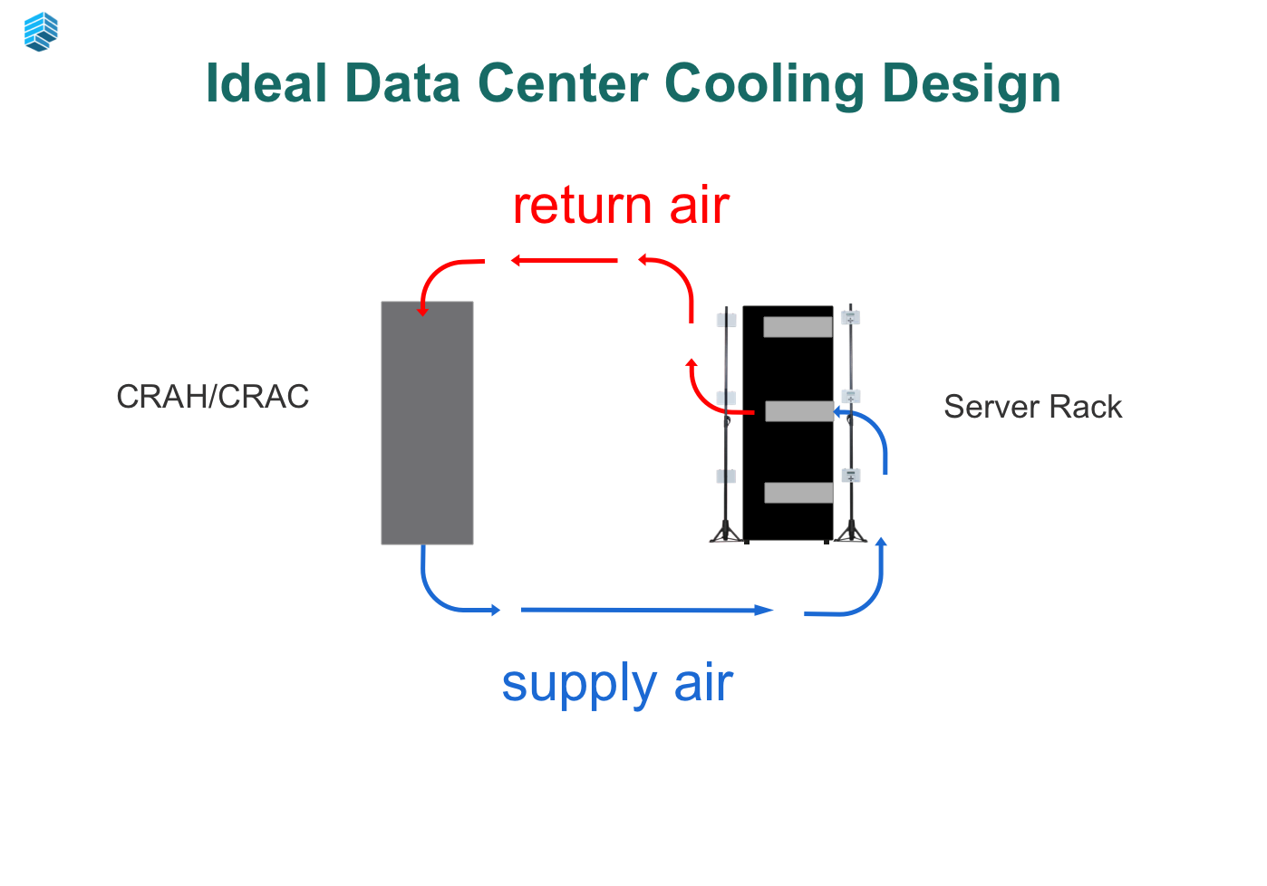 Hot exhaust air leaves the back of the rack but doesn’t make it back to the cooling unit. Instead, it finds its way into the cold aisle and mixes with supply air.